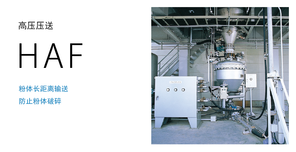 主要輸送對象 碳化物,膨潤土,鑄造砂,貝殼砂,微粉炭,碳酸鈣,氧化鋁,染料,顔料,氫氧化鋁,澱粉 利用運輸空氣的(de)靜壓,可(kě)輸送插頭狀的(de)粉體。 HAF的(de)輸送速度為(wèi)4~6m/s的(de)低(dī)速運輸,幾乎不會造成粉體破碎。 适用于低(dī)破碎 長(cháng)距離(lí) 大量輸送